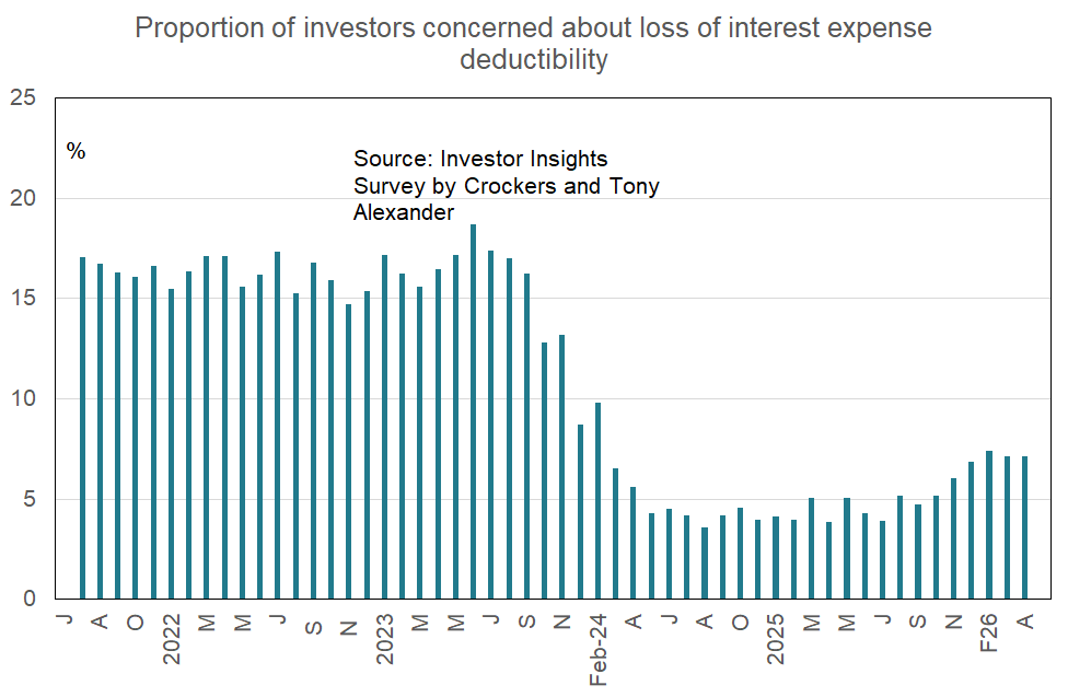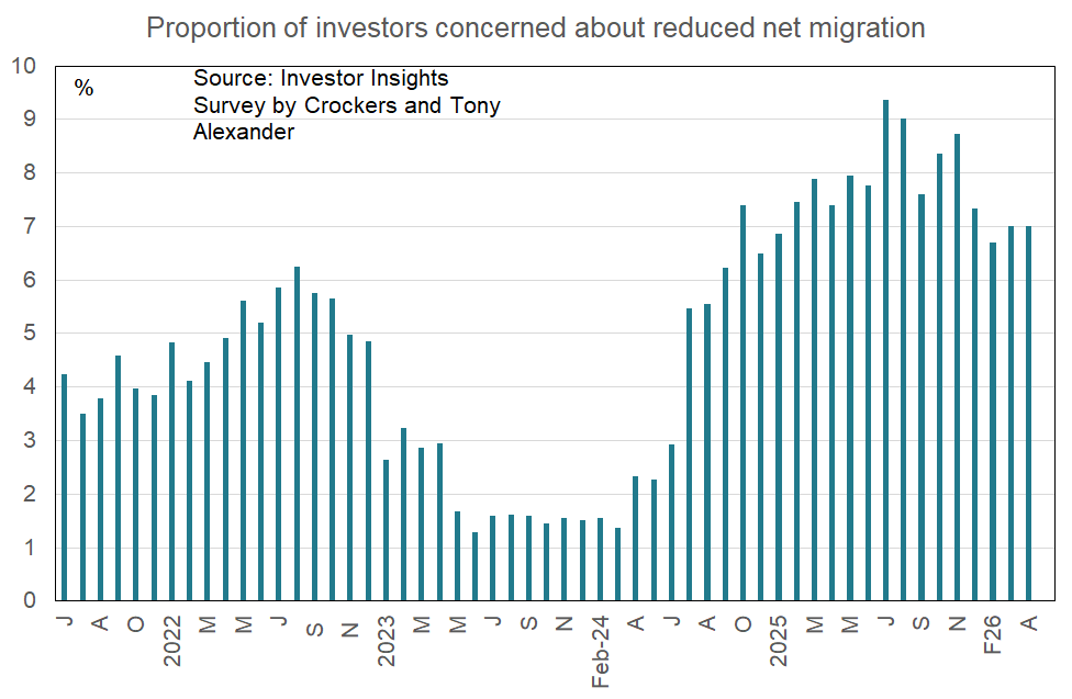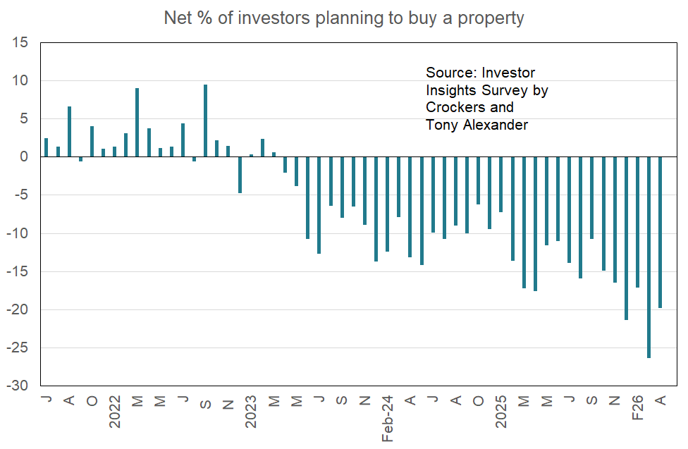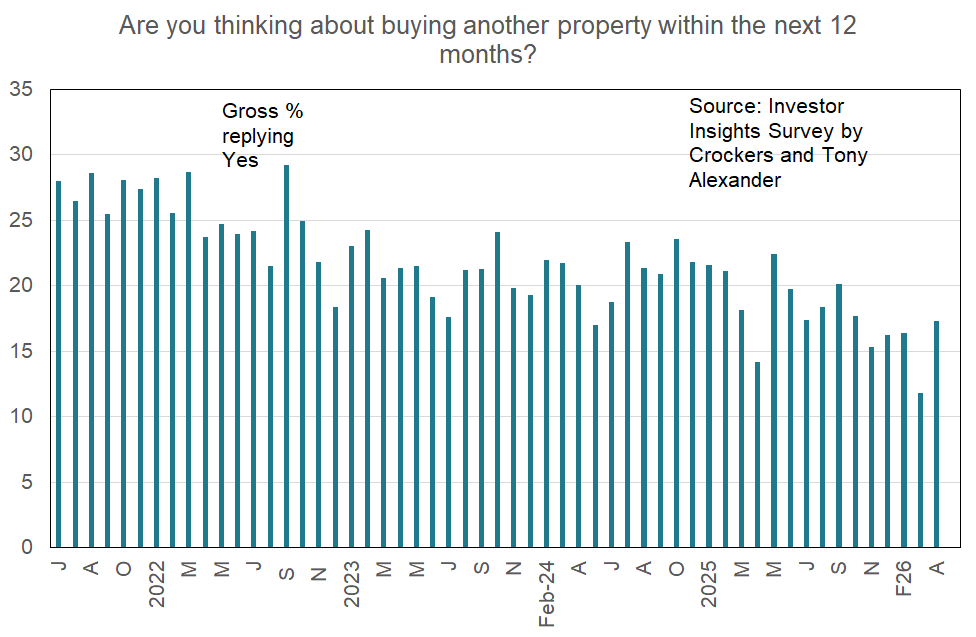 - Most of the results this month are close to where they were in March apart from a slight improvement in the net proportion of investors thinking about making another property purchase.