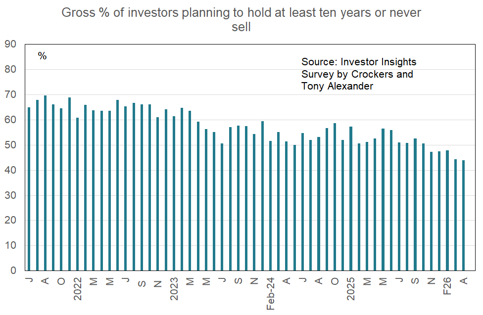 The proportion of investors thinking about selling a property in the coming year edged down slightly in this month’s survey to 37% from 38% in March.